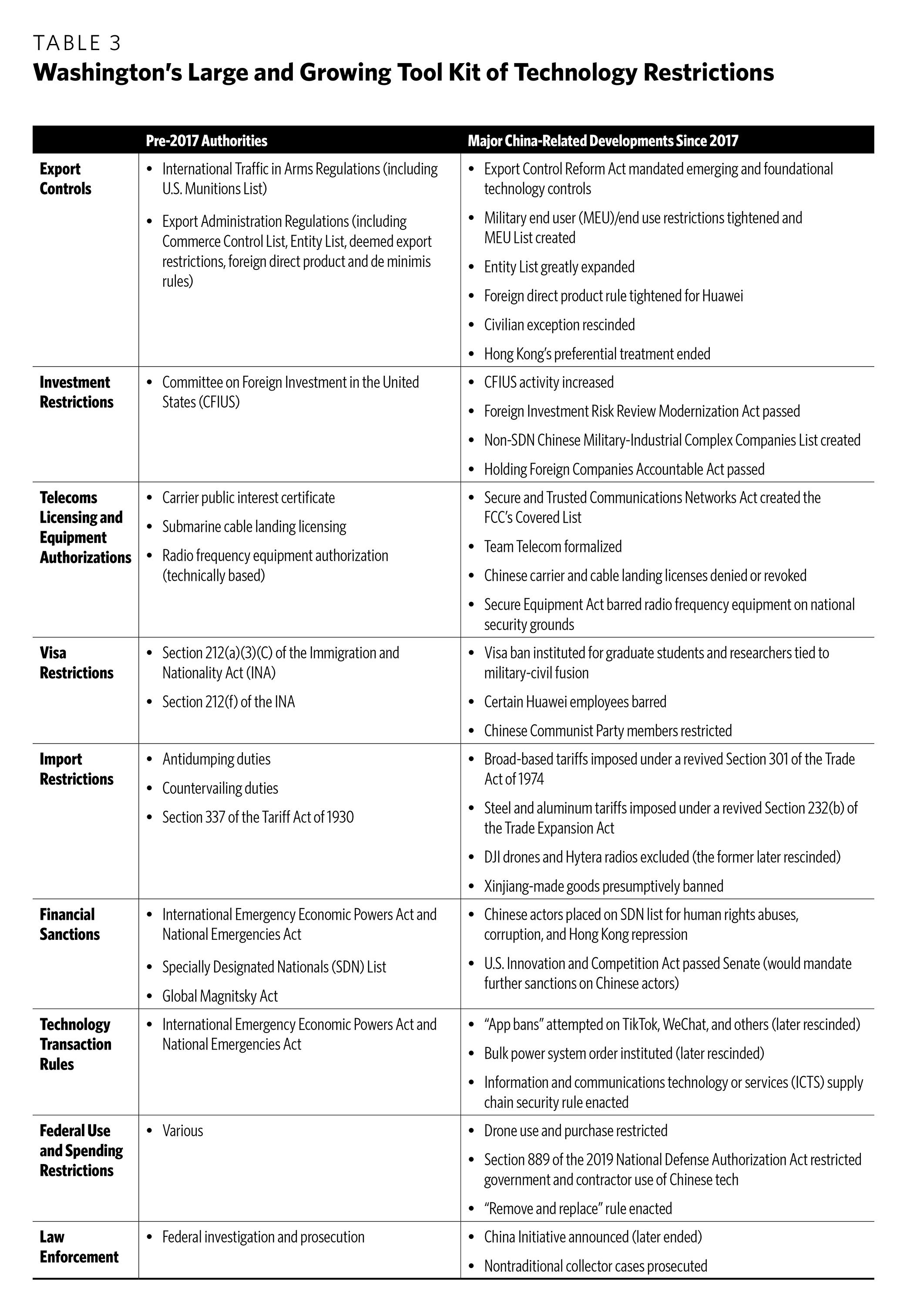 What follows is a primer on key U.S. government authorities that have been, or could be, used to curb the flow of technology to and from China. It seeks to outline, in a slightly simplified form, the most important legal authorities. It describes which agencies are involved, what discretion they have, and how the Chinese tech sector has been targeted in recent years.16