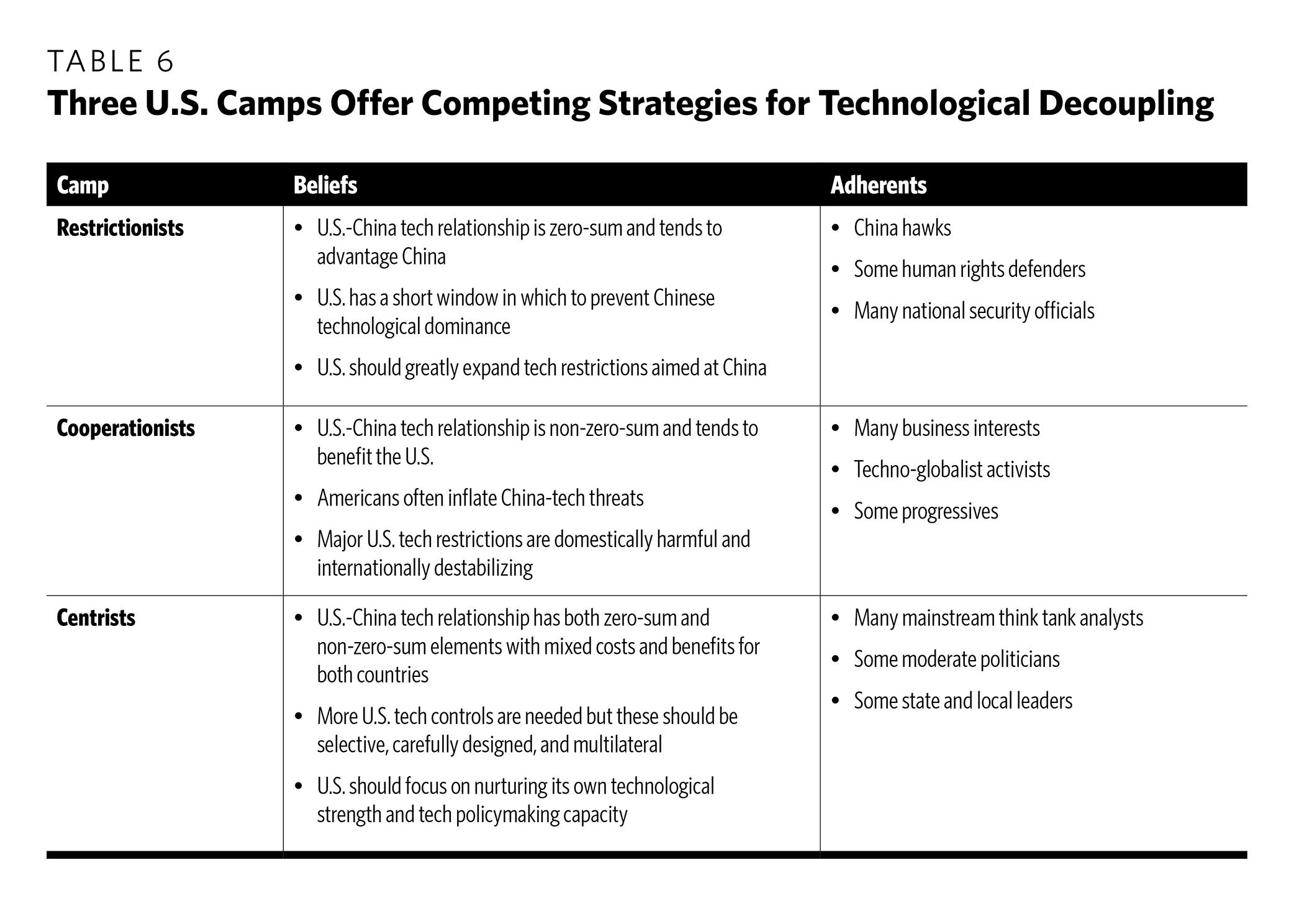 Leading proposals can be grouped into three general camps. First, a “restrictionist” camp believes that the U.S.-China technology relationship is zero-sum and that it tends to favor Beijing, necessitating dramatic curtailment of bilateral tech ties. This group—including China hawks, some human rights defenders, and many national security officials—fears U.S. complacency during what it sees as a closing window to prevent China’s technological dominance. Second, a “cooperationist” camp perceives U.S.-China tech ties as non-zero-sum and largely beneficial to America, casting doubt on key elements of Washington’s decoupling agenda. This group—including many business interests, techno-globalist activists, and some progressives—fears U.S. overreaction, inflated threat perceptions, and excessive confidence in restrictive tools.