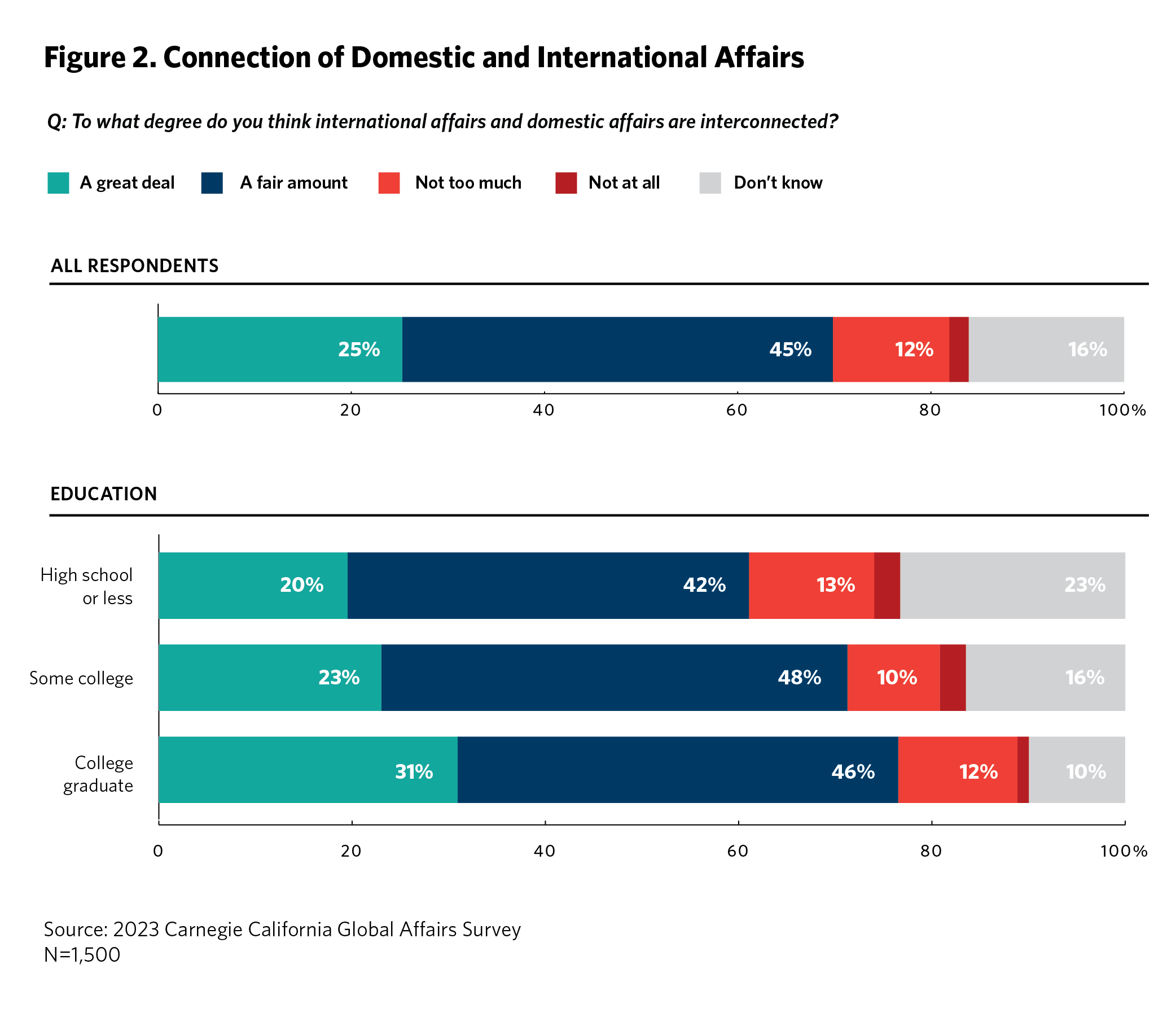 Looking at the intersection of global and local affairs broadly, an overwhelming majority of Californians think that international affairs and domestic affairs are interconnected (25 percent say “a great deal” and 45 percent “a fair amount”). Just 14 percent say they are not interconnected, while 16 percent are unsure. The belief that international affairs and domestic affairs are interconnected is more prevalent among older, affluent, and college-educated residents.